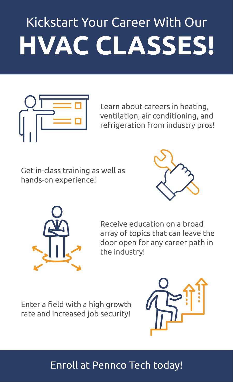 The economy is in a good place, and skilled laborers are being hired at record numbers! If you want to strike while the iron is hot, then now is the perfect time to get educated in growing fields and make an impact on the job market. We have courses in a selection of fast-growing careers at Pennco Tech. The following infographic tells you more about our HVAC&R technician schools in Bucks County and Camden County.